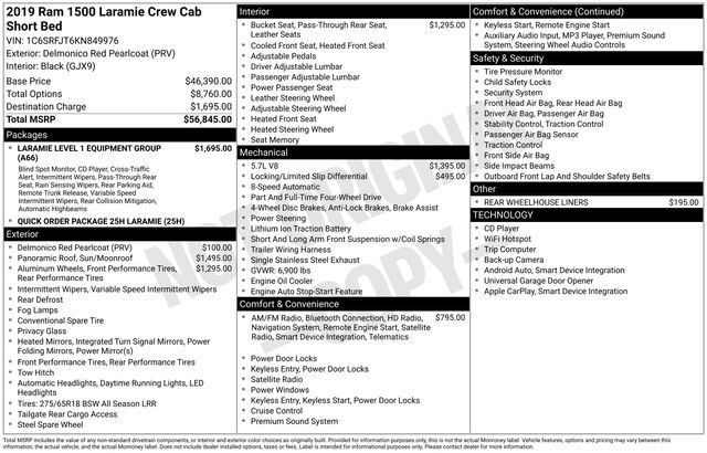 Safety is a top priority in the 2019 Ram 1500 Laramie, with advanced driver-assistance technologies like electronic stability control, traction control, and a rearview camera to help you navigate with confidence. The robust construction and thoughtful engineering of this truck provide a sense of security and control, whether you're navigating city streets or tackling rugged terrain.