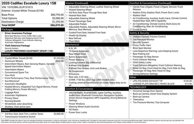 South Fork Chrysler Jeep Dodge Ram is very proud to offer this wonderful 2020 Cadillac Escalade in Crystal White Tricoat. This vehicle has passed our comprehensive inspection and comes with the following features: Clean CARFAX. *Bluetooth, Hands-Free connection, Navigation!, 3rd Row Seats, Backup Camera, Cruise Control, Keyless Entry, Power Locks, Power Windows, Heated Seats, Leather Seats, Premium Wheels, Sunroof / Moonroof, Towing Package, Automatic Headlights, Apple Carplay, Android Auto, Kona Brown With Jet Black Accents Leather, 12-Way Power Front Passenger Seat Adjuster, 16 Speakers, 3rd row seats: split-bench, 4-Wheel Disc Brakes, ABS brakes, Adaptive suspension, Adjustable pedals, Air Conditioning, AM/FM radio: SiriusXM, Apple CarPlay/Android Auto, Auto tilt-away steering wheel, Automatic Emergency Braking, Automatic temperature control, Bose Centerpoint 16 Speaker Surround Sound System, Brake assist, Driver Awareness Package, DVD-Audio, Electronic Stability Control, Forward Collision Alert, Front Bucket Seats, Front dual zone A/C, HD Radio, Heads-Up Display, Heated & Cooled Driver & Front Passenger Seats, Heated front seats, Heated rear seats, Inclination Sensor, IntelliBeam Automatic High Beam On/Off, Lane Change Alert w/Side Blind Zone Alert, Lane Keep Assist w/Lane Departure Warning, Leather Seating Surfaces, Magnetic Ride Control Suspension, Memory seat, Navigation System, Pedal memory, Power Configurable Second Row Bucket Seats, Power door mirrors, Power driver seat, Power Liftgate, Power steering, Power Tilt-Sliding Sunroof w/Express-Open/Close, Power windows, Preferred Equipment Group 1SB, Radio data system, Rear air conditioning, Rear Camera Mirror, Rear Camera Mirror Washer, Rear Cross Traffic Alert, Rear window defroster, Reconfigurable 4-Color Head-Up Display, Safety Alert Seat, Speed control, Spoiler, Theft-Deterrent Alarm System, Theft-Deterrent Package, Traction control, Vehicle Interior Movement Sensor.