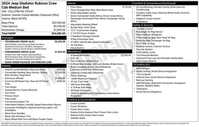 Experience the ultimate in off-road capability, advanced technology, and rugged style with the 2024 Jeep Gladiator Rubicon. This vehicle is priced at $37,997 and is ready to take you on your next adventure. Visit our showroom today to see it in person and take it for a test drive.