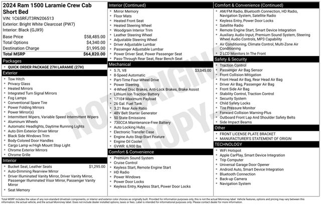 South Fork Chrysler Jeep Dodge Ram is pumped up to offer this fantastic 2024 Ram 1500 in Bright White Clearcoat. This vehicle has passed our comprehensive inspection and comes with the following features: CARFAX One-Owner. Odometer is 1760 miles below market average! *4WD, Bluetooth, Hands-Free connection, Navigation!, Backup Camera, Cruise Control, Keyless Entry, Power Locks, Power Windows, Heated Seats, Leather Seats, 10 Speakers, 4-Wheel Disc Brakes, 4G LTE Wi-Fi Hot Spot, ABS brakes, Air Conditioning, Apple CarPlay, Apple CarPlay/Android Auto, Auto-dimming Rear-View mirror, Automatic temperature control, Brake assist, Google Android Auto, GPS Navigation, Leather steering wheel, Navigation System, Outside temperature display, Overhead console, Panic alarm, ParkView Rear Back-Up Camera, Power 8-Way Driver & Passenger Seats, Power door mirrors, Power driver seat, Power steering, Power windows, Power-Folding Mirrors, Quick Order Package 27H Laramie, Security system, Speed control.