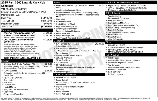 Whether you're tackling tough job sites, towing heavy loads, or just need a capable and comfortable daily driver, this 2025 Ram 3500 Laramie DRW Crew Cab 4x4 is the perfect choice. With its impressive features, robust performance, and premium styling, it's sure to exceed your expectations. Visit our showroom today to take this remarkable truck for a test drive and experience the power and capability of the Ram 3500 for yourself.